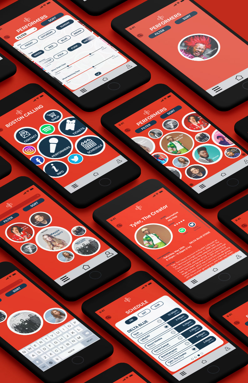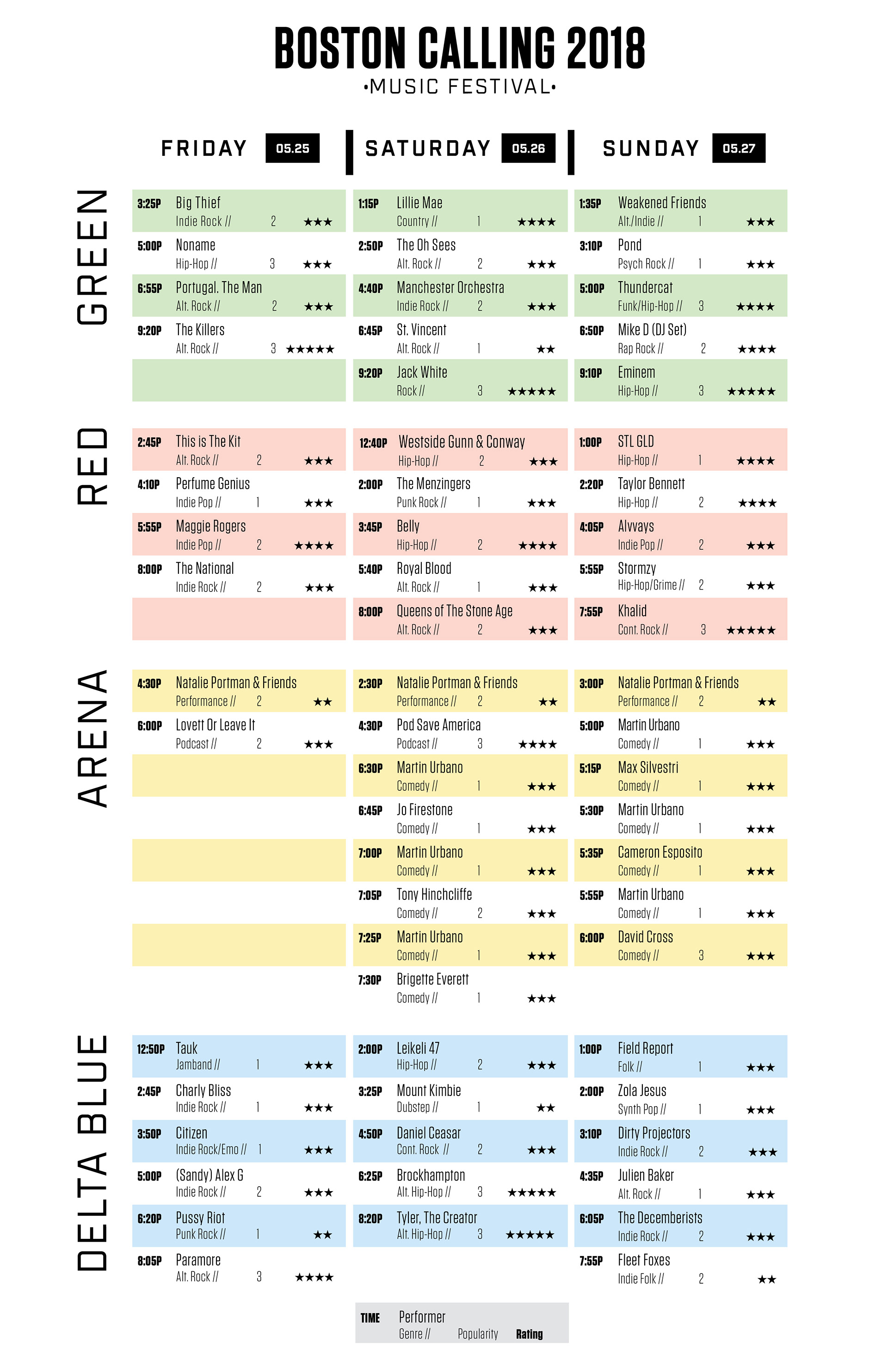 Series of posters highlighting three artists who performed at the 2018 Boston Calling Music Festival, as well as an interface for the festival and an accompanying schedule. Colors for each poster were sampled from each artists most recent album at the time.